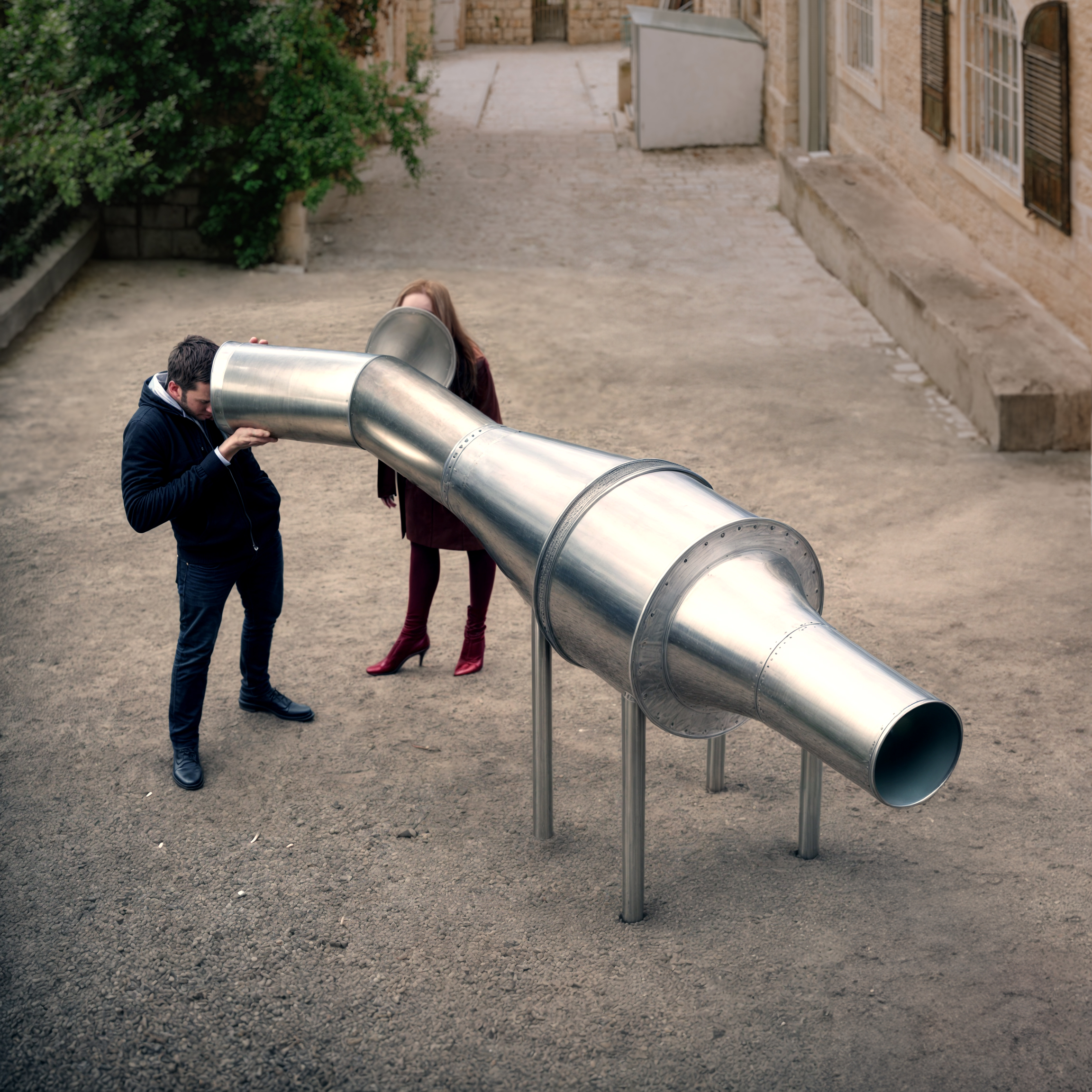 The installation created a sensation of “peeking out” from a closed, protected space. It combined physical components with video projections to create an illusion of open space, challenging visitors’ perception of place and time. The periscope served as a symbol of the hatch Noah opened to release the dove – a gesture of hope and anticipation.